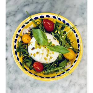 Tomates, fior di latte,champignons, jambon blanc aux herbes, pesto, huile d’olive*